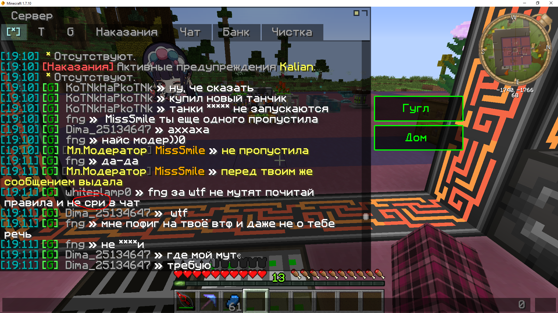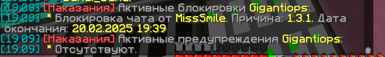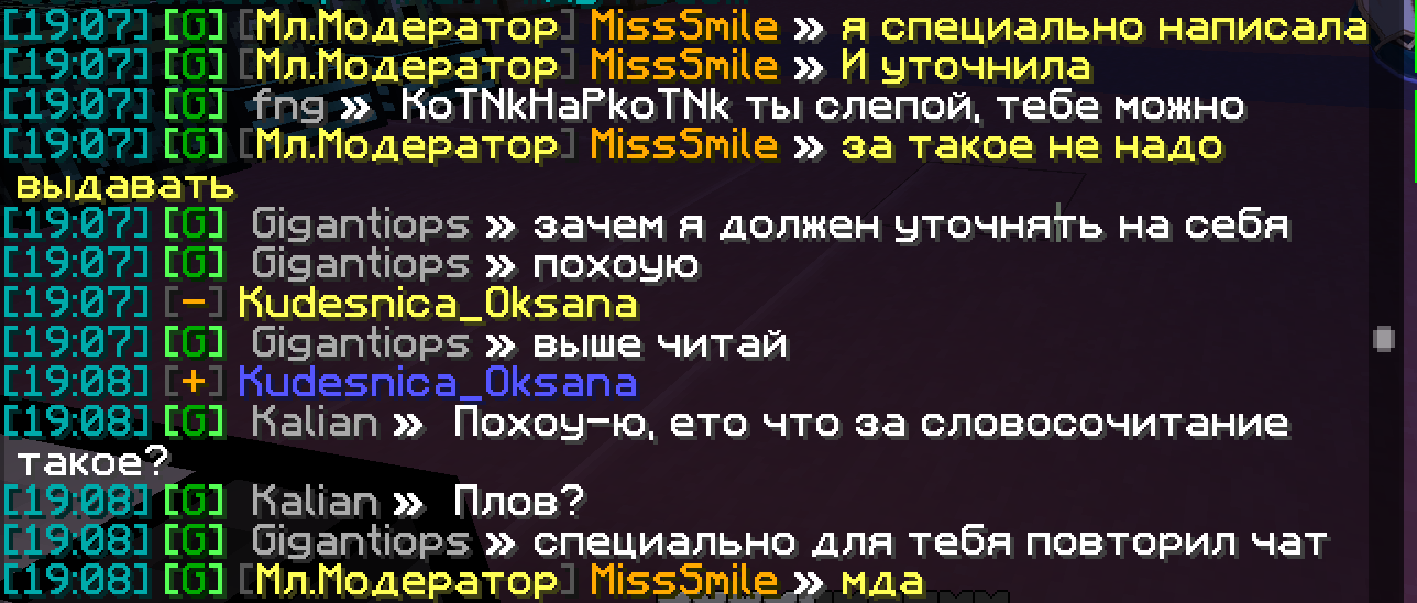fng Posted February 20, 2025 Share Posted February 20, 2025 1. MissSmile 2. Примерно 19:06-19:21 3. Доказательства (скриншоты, видео) 4. Игнорирование нарушение со стороны мл. модера. Сначала гигантипусу выдавала мут около 5ти минут за очевидный обход мата, затем Калиану выдала тоже спустя около 5ти минут (примерный тайминг). Ну и самое главное - до сих пор не выдала наказание игроку с ником whiteplamp0 за очевидное "сри". Если на первые два еще можно как-то каким-то образом закрыть глаза, то третье это явное нарушение со стороны модератора. Т.к. модератор не первый день на посту и был до этого модеров просьба не проводить "бесед" а сразу влепить выговор. Ибо это явный факт игнорирования модератором нарушения. Отмазки по типу "чат улетел" не принимаются. 2 1 Link to comment Share on other sites More sharing options...